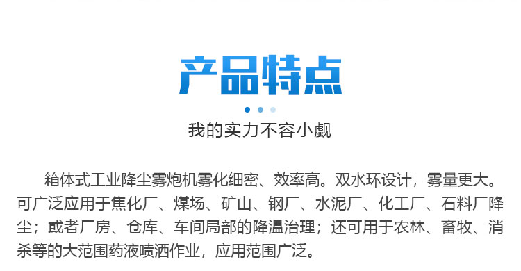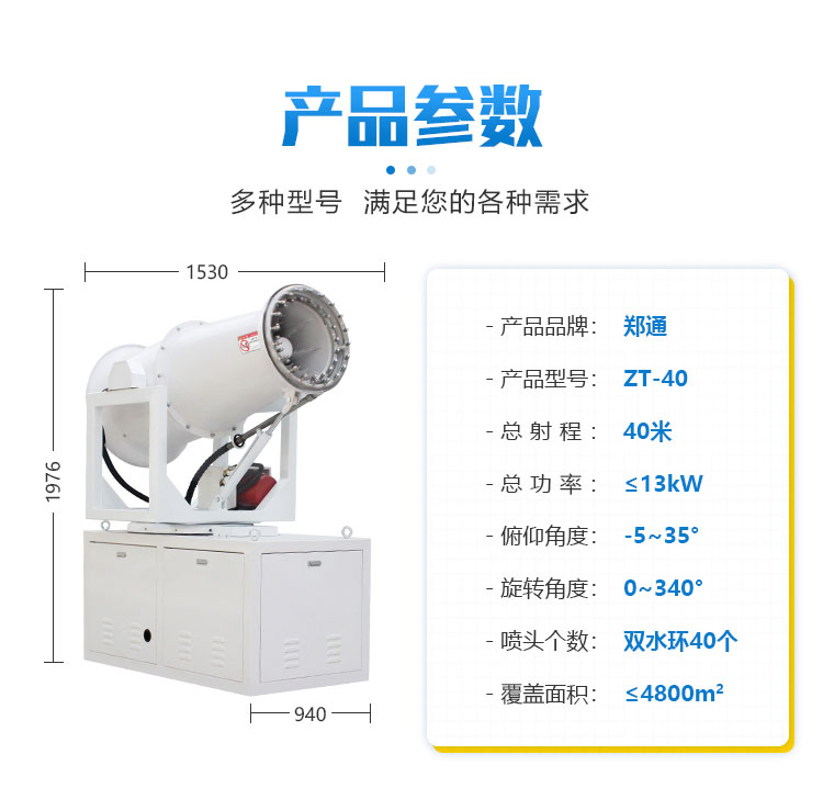 產品特點:40米降塵霧炮機射程遠、覆蓋面積大;加速塵埃降沉,抑制塵埃擴散,雙水環設計,作業效率高、霧量更大。