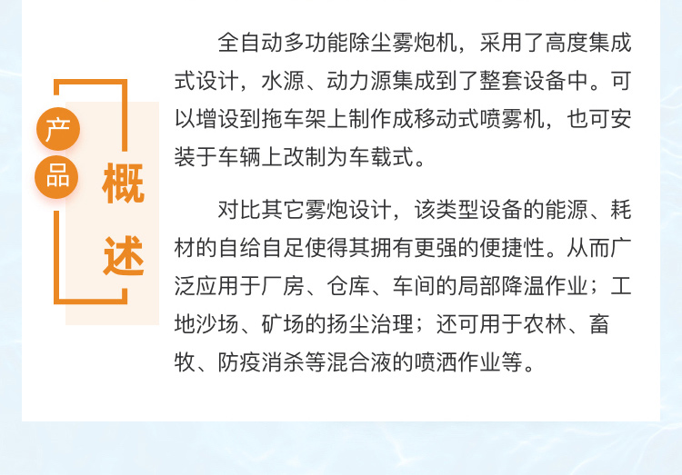 主要用途:適用于拆遷工地、冶金鋼鐵企業(yè)、采礦區(qū)域、煤化工企業(yè)、水泥廠、發(fā)電廠、建筑工地、物料和礦產(chǎn)主要適用于品露天堆放廠、混凝土處理廠、垃圾堆放場(chǎng)、垃圾焚燒廠、沙廠、干式物料倉(cāng)庫(kù)、露天爆破、重度粉塵區(qū)域。