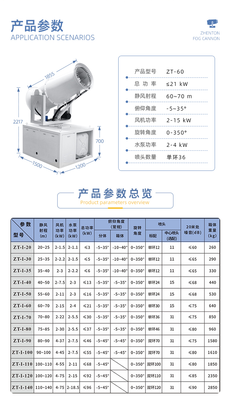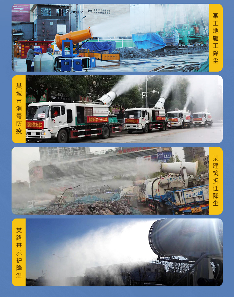 主要用途:建筑工地 煤場,工業(yè)除塵,農業(yè),園林綠化等飛機場、高速公路、車站、碼頭、公共場所、運動場地、炎熱場地等降塵保濕降溫消毒。