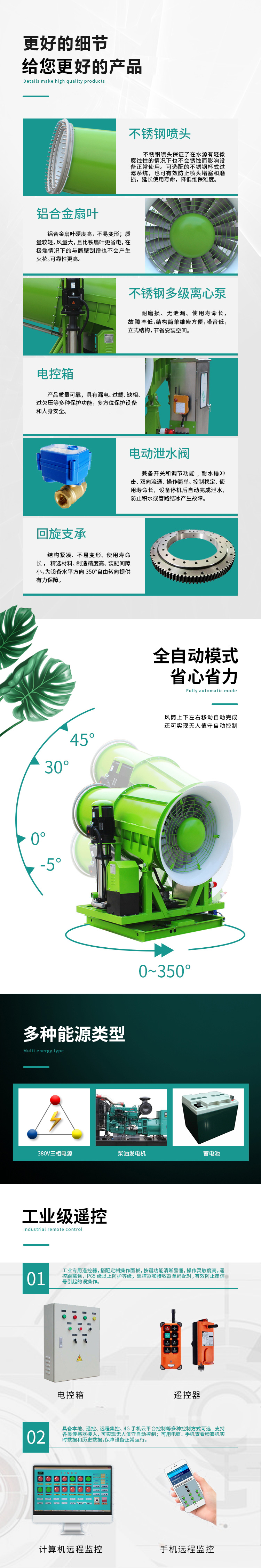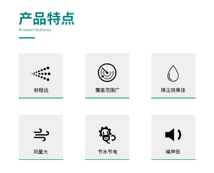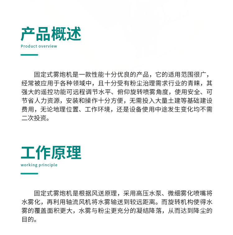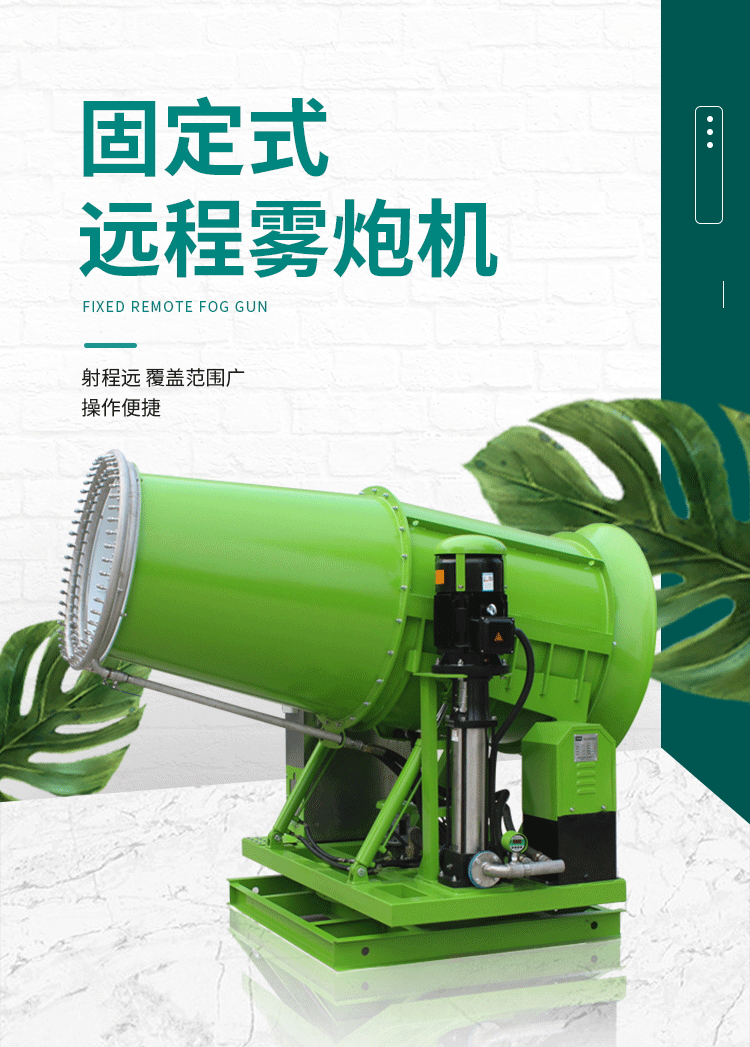 產(chǎn)品特點:高臺固定式霧炮機射程遠、覆蓋范圍廣、工作效率高、可以實現(xiàn)精量噴霧;噴出的霧粒細小,能快速將粉塵抑制;配套動力靈活,使用安全可靠。