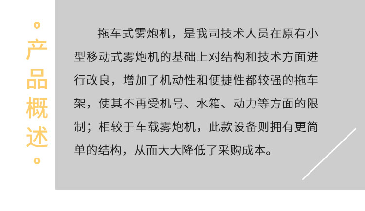 產品特點:拖車式霧炮機采用四輪牽引設計,移動便捷、射程遠、覆蓋范圍廣,可在多種特殊環境使用。