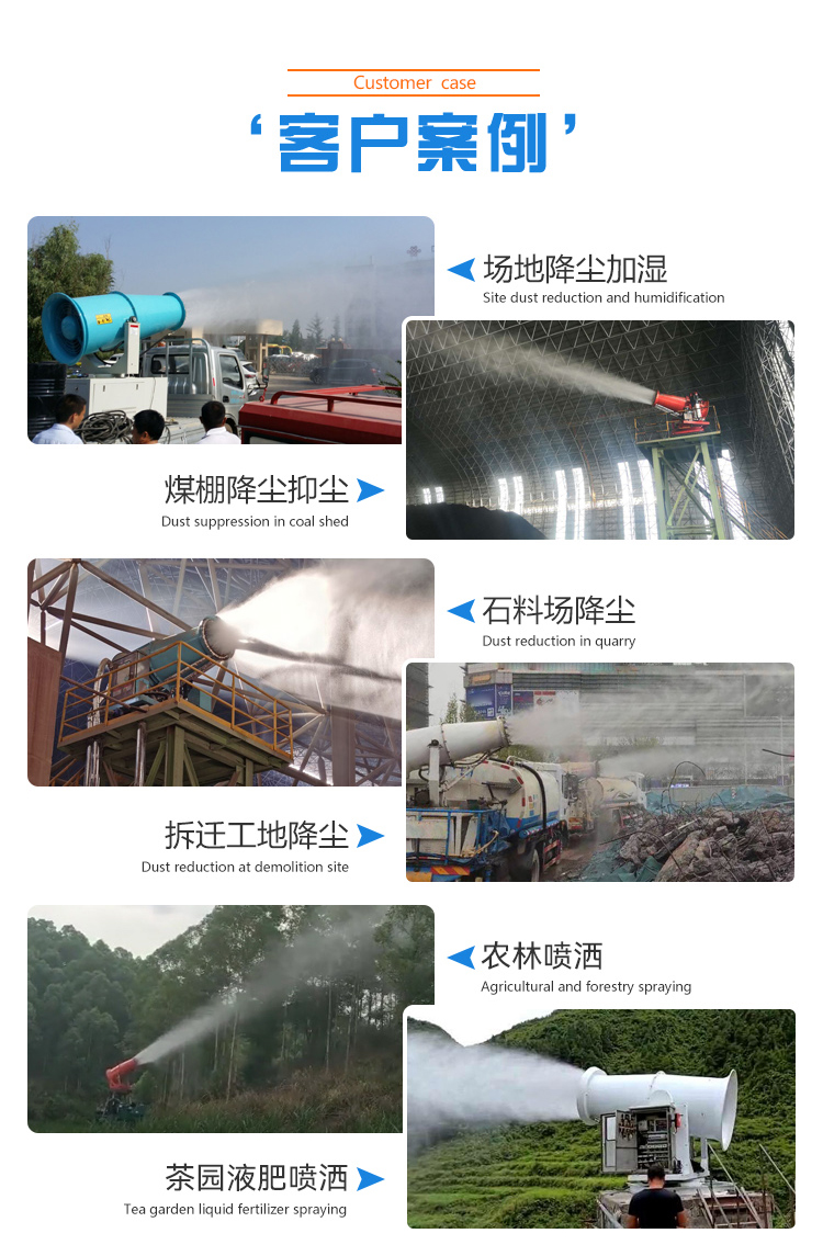 主要用途:用于煤礦場、城市拆遷工地、冶金鋼鐵企業(yè)、采礦區(qū)域、煤化工企業(yè)、水泥廠、火力發(fā)電廠、物料和礦產品露天堆放廠、混凝土處理廠、垃圾堆放場、垃圾焚燒廠、沙廠、干式物料倉庫、露天爆破、重度粉塵區(qū)域。