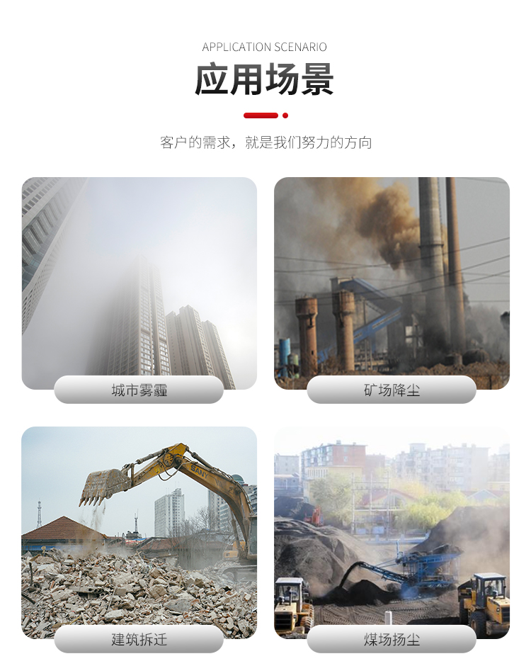 主要用途:用于城市拆遷工地、冶金鋼鐵企業、采礦區域、煤化工企業、水泥廠、火力發電廠、建筑工地、物料和礦產品露天堆放廠、混凝土處理廠、垃圾堆放場、垃圾焚燒廠、沙廠、干式物料倉庫、露天爆破、重度粉塵區域。