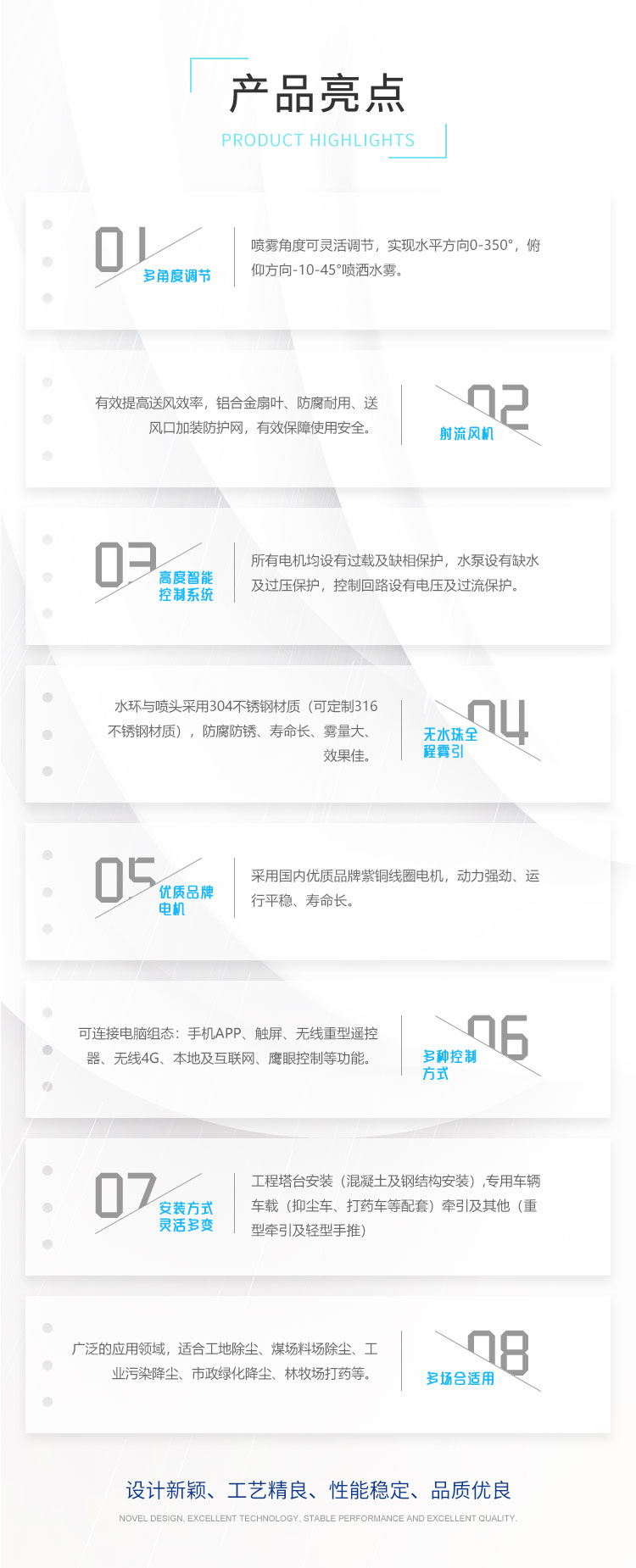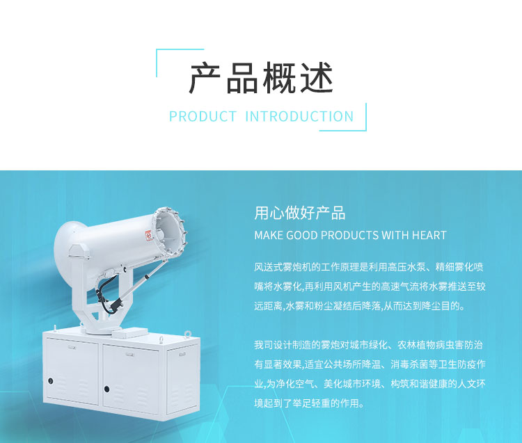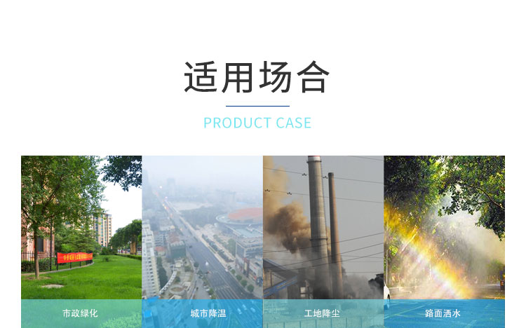主要用途:建筑工地 煤場,工業除塵,農業,園林綠化等飛機場、高速公路、車站、碼頭、公共場所、運動場地、炎熱場地等降塵保濕降溫消毒。