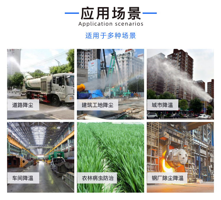主要用途:建筑垃圾或廢渣廢料機(jī)械作業(yè)局部揚塵治理、重型車運輸中道路揚塵污染治理;飛機(jī)場、高速公路、車站、碼頭、公共場所、運動場地、炎熱場地等降塵保濕降溫消毒。