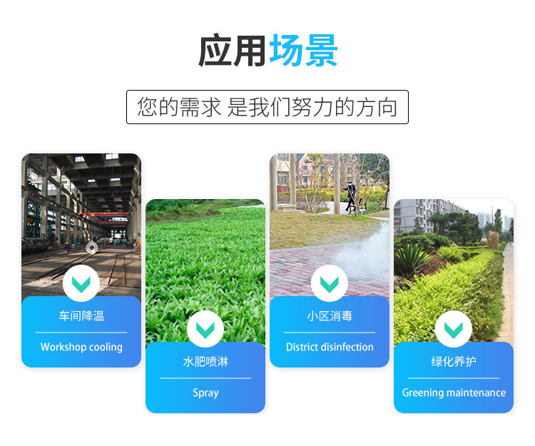 主要用途:車(chē)間通風(fēng)降溫、植被養(yǎng)護(hù)澆水加濕、垃圾站除異味、植物作物水肥藥物噴淋等。