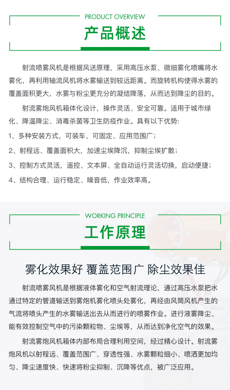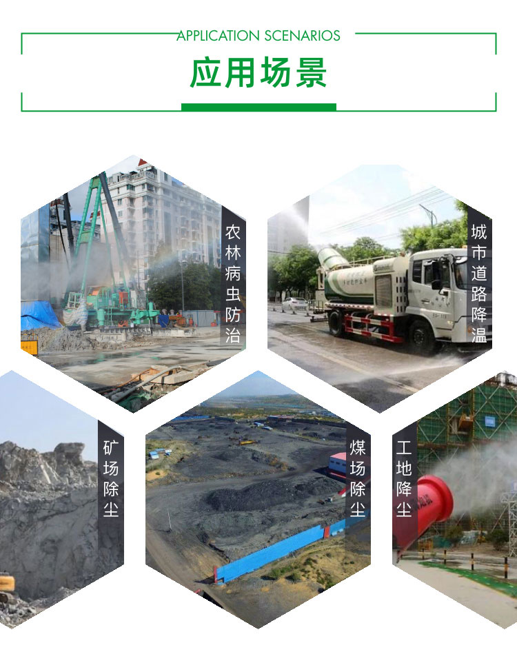 主要用途:用于煤礦場、城市拆遷工地、冶金鋼鐵企業、采礦區域、煤化工企業、水泥廠、火力發電廠、物料和礦產品露天堆放廠、混凝土處理廠、垃圾堆放場、垃圾焚燒廠、沙廠、干式物料倉庫、露天爆破、重度粉塵區域。