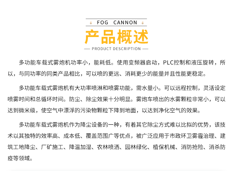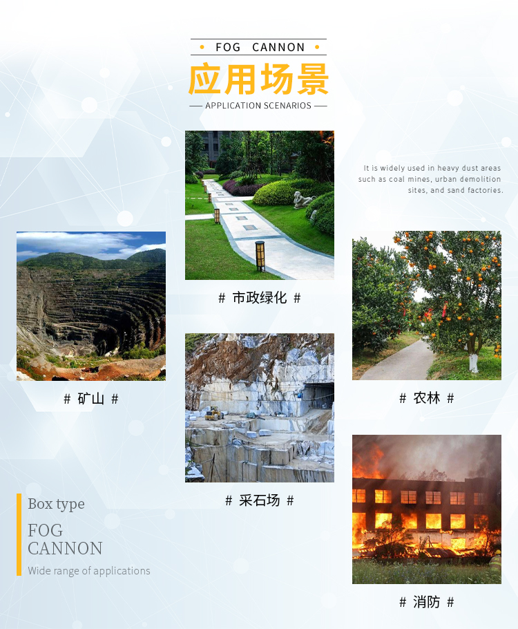主要用途:用于煤礦場、城市拆遷工地、冶金鋼鐵企業、采礦區域、煤化工企業、水泥廠、火力發電廠、物料和礦產品露天堆放廠、混凝土處理廠、垃圾堆放場、垃圾焚燒廠、沙廠、干式物料倉庫、露天爆破、重度粉塵區域。