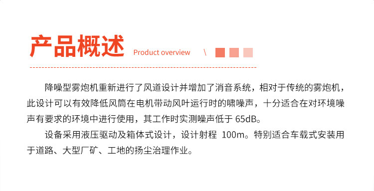產(chǎn)品特點(diǎn):降噪型液壓霧炮機(jī)增加了消音系統(tǒng),相對于傳統(tǒng)的霧炮機(jī),此設(shè)計(jì)可以有效降低風(fēng)筒在電機(jī)帶動風(fēng)葉運(yùn)行時(shí)的嘯噪聲,十分適合在對環(huán)境噪聲有要求的環(huán)境中進(jìn)行使用,其工作時(shí)實(shí)測噪聲低于65dB。