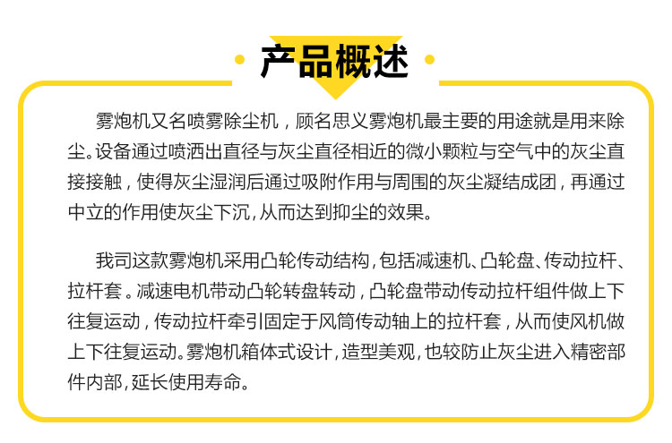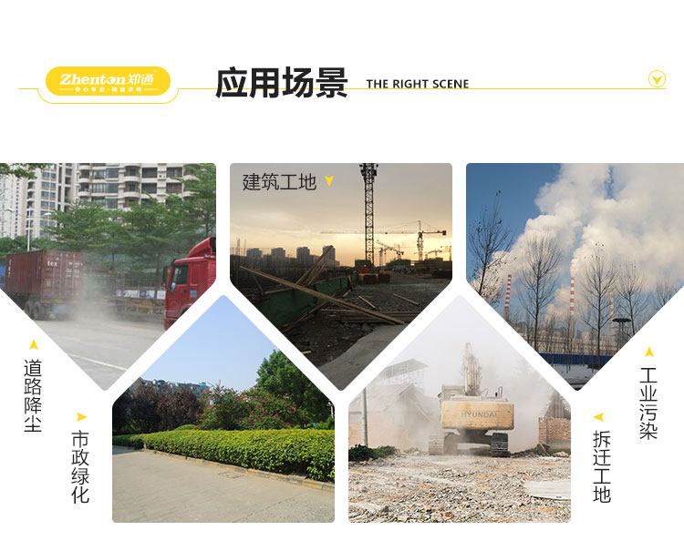 主要用途:用于煤礦場(chǎng)、城市拆遷工地、冶金鋼鐵企業(yè)、采礦區(qū)域、煤化工企業(yè)、水泥廠、火力發(fā)電廠、物料和礦產(chǎn)品露天堆放廠、混凝土處理廠、垃圾堆放場(chǎng)、垃圾焚燒廠、沙廠、干式物料倉(cāng)庫(kù)、露天爆破、重度粉塵區(qū)域。