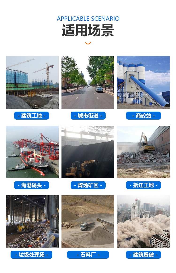 主要用途:用于煤礦場地、冶金鋼鐵企業(yè)、采礦區(qū)域、煤化工企業(yè)、水泥廠、火力發(fā)電廠、建筑工地、物料和礦產(chǎn)品露天堆放廠、混凝土處理廠、垃圾堆放場、垃圾焚燒廠、沙廠、干式物料倉庫、露天爆破、重度粉塵區(qū)域。