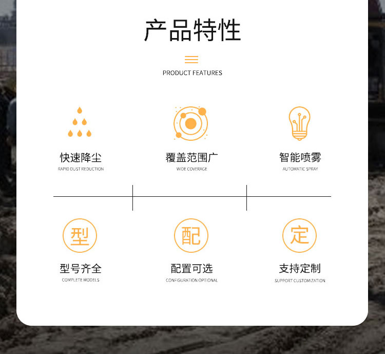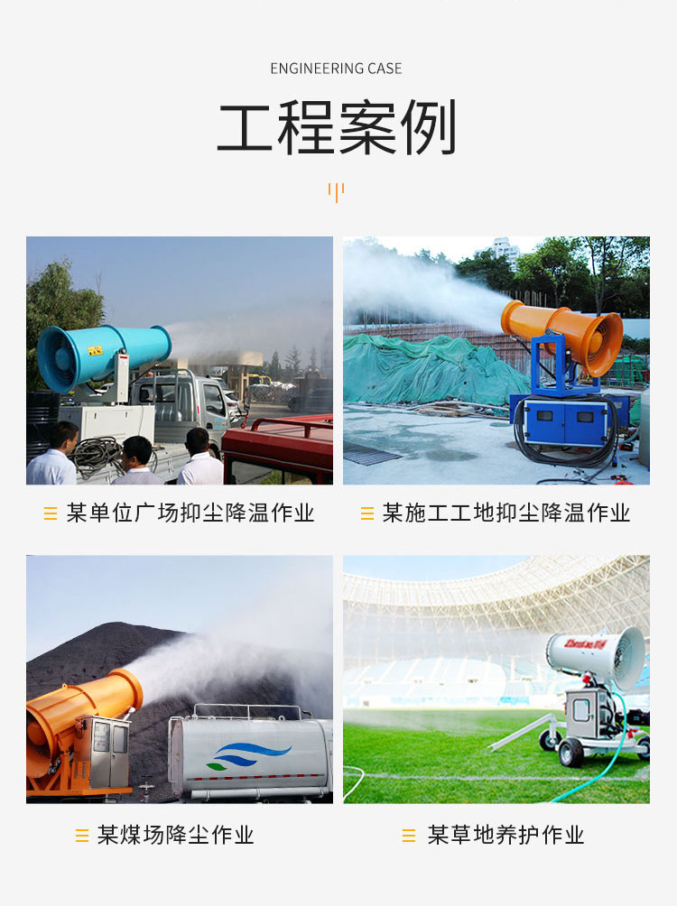 主要用途:建筑工地 煤場,工業除塵,農業,園林綠化等飛機場、高速公路、車站、碼頭、公共場所、運動場地、炎熱場地等降塵保濕降溫消毒。
