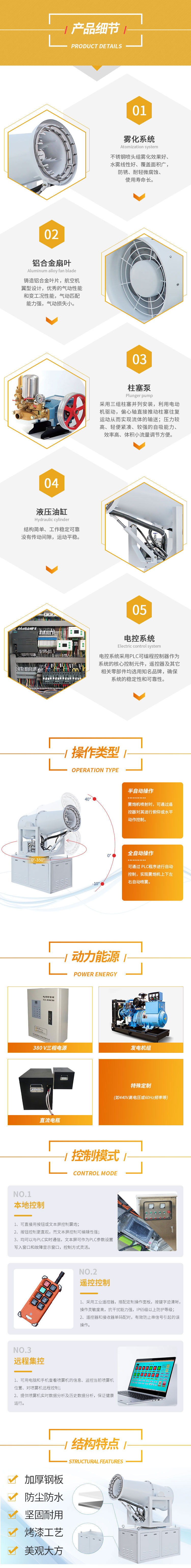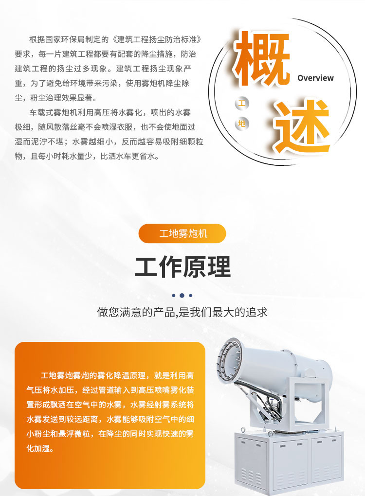產品特點:工地車載式霧炮機利用高壓將水霧化,噴出的水霧極細,隨風散落絲毫不會噴濕衣服,也不會使地面過濕而泥濘不堪;水霧越細小,反而越容易吸附細顆粒物,且每小時耗水量少,比灑水車更省水。