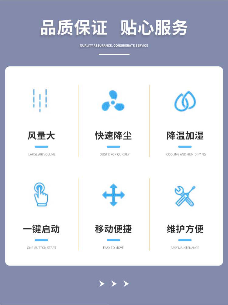 產(chǎn)品特點(diǎn):農(nóng)林移動(dòng)式噴霧風(fēng)機(jī)這款產(chǎn)品具有一鍵啟動(dòng)功能,能起到快速降塵、降溫的作用;移動(dòng)便捷,方便維修。