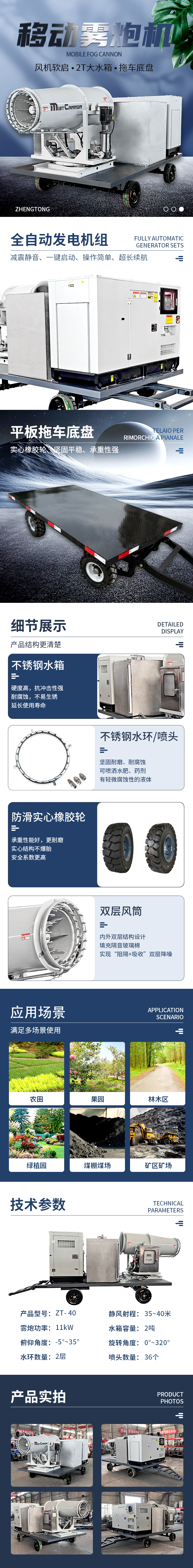 產品特點:這款ZT-40型拖車式移動霧炮機,是一款專用于,煤棚、礦山、農藥噴灑、森林綠化等場景噴霧打藥使用的霧炮機,整體采用拖車底盤裝配全自動發電機組,減震靜音,一鍵啟動操作方便,續航時間長,還搭配了一個2T不不銹鋼大水箱,可噴灑1200m3/h。