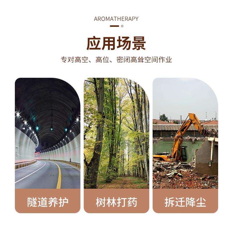 主要用途:隧道養(yǎng)護(hù)、樹林打藥、拆遷降塵、煤棚超低排放、廢水蒸發(fā)、礦山破碎機(jī)降塵等。