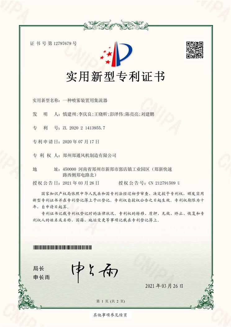 一種噴霧裝置用集流器實用新型專利證書