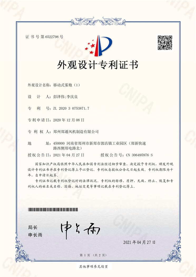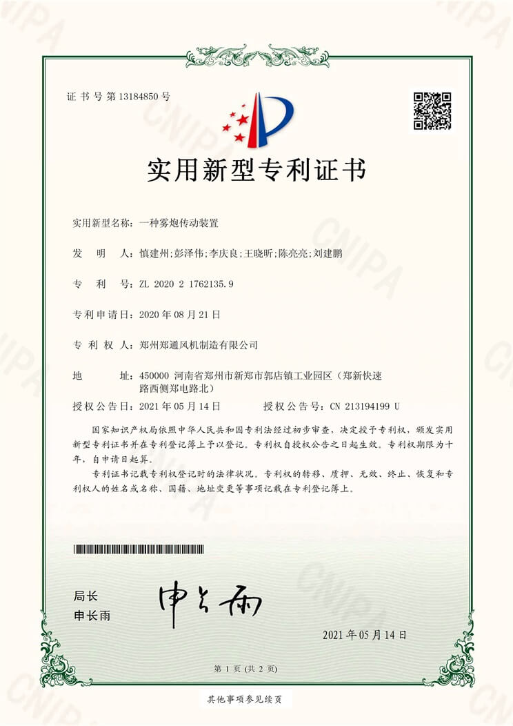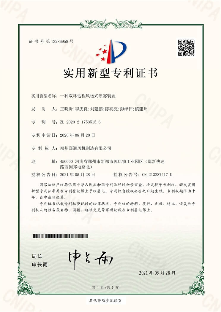 遠程風送式噴霧風機實用新型專利證書